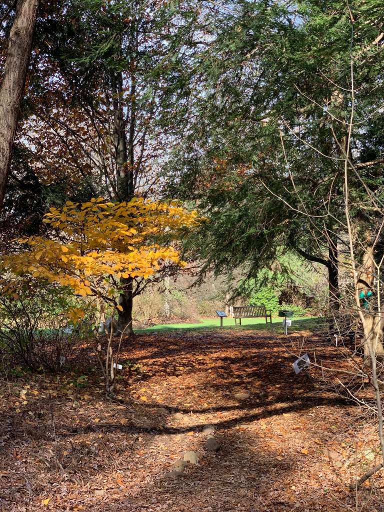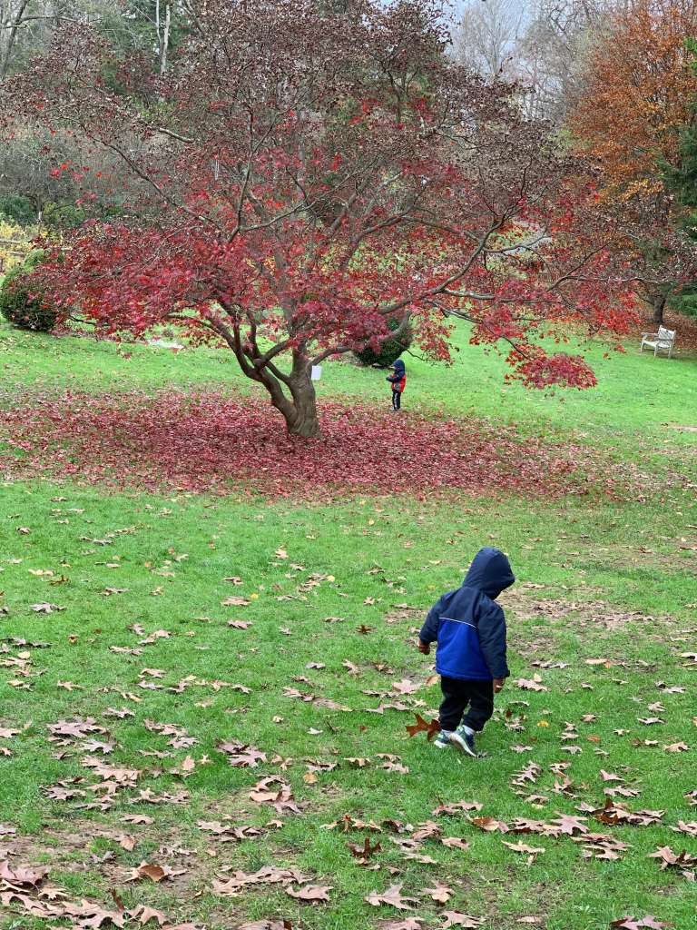 We walked the wildflower trail, and while they weren’t in bloom, we did see a piece of Revolutionary history, and enjoyed a toddler snack on a park bench in solitude overlooking the gardens. Japanese maples were still clothed in brilliant red and we appreciated the tree tag labels so we could call them by name.