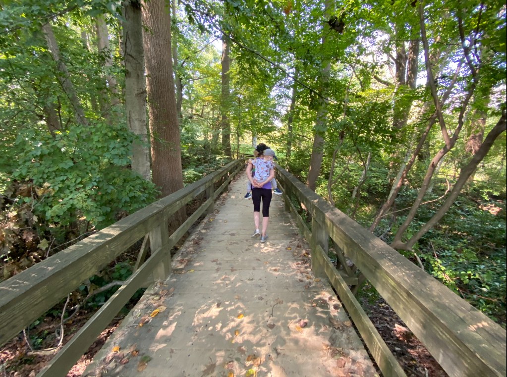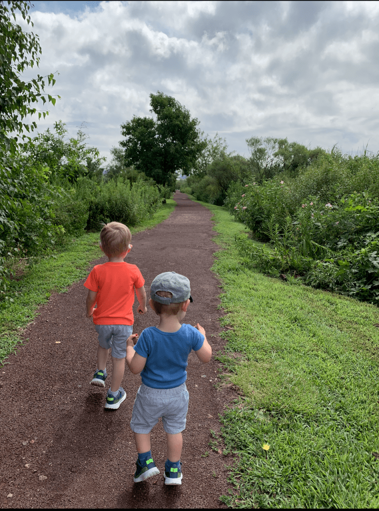 Today, I hiked 2.5 miles solo with my almost 2 year old and 4 year old without a stroller. We played “I Spy” with binoculars in hand and spotted turtles, frogs, owls, hawks, fish, cardinals, sparrows, squirrels, butterflies, and so many chipmunks that we dubbed the blue trail “Chipmunk Way”. I let my 4 year old choose the trails we blazed, taught my boys how to follow trail markers, walked the plank along wooden footbridges, hopped over tree roots, and stood still and named the sounds we heard in the moment – the harmonious tweets of birds, rustling leaves, and the scurrying feet of chipmunks racing along trees.